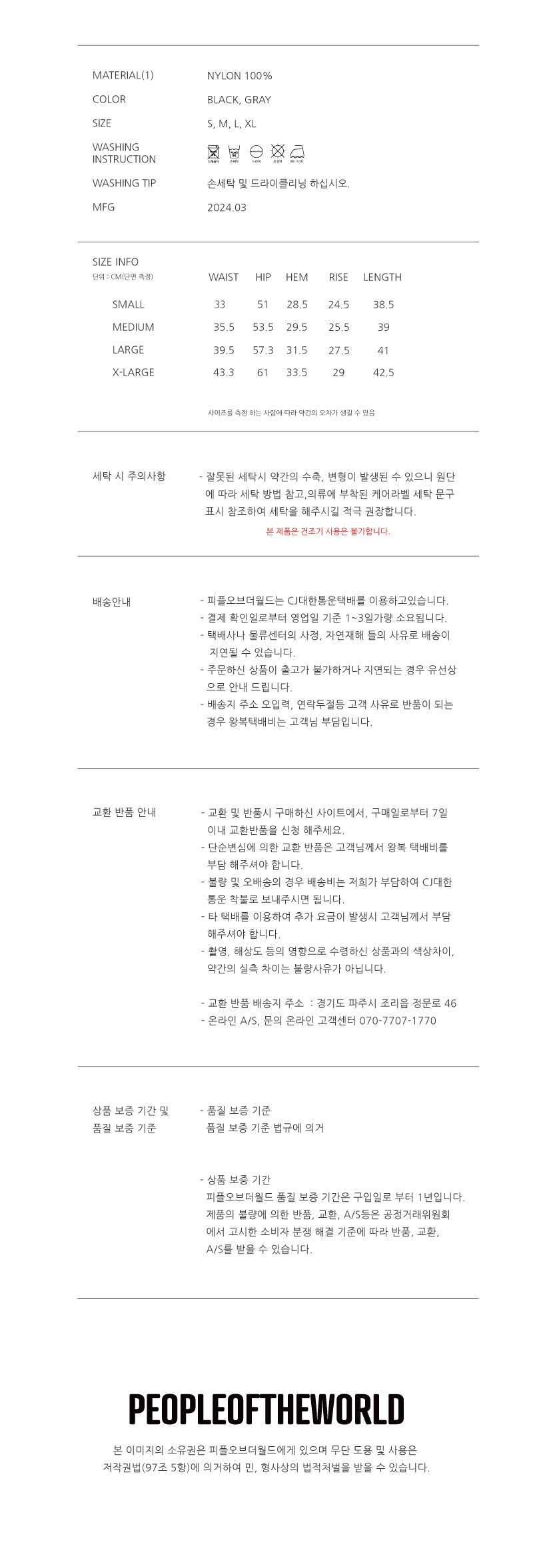 °나일론 100% 원단으로 건조 시간이 빠르며, 구김이 잘 생기지 않음