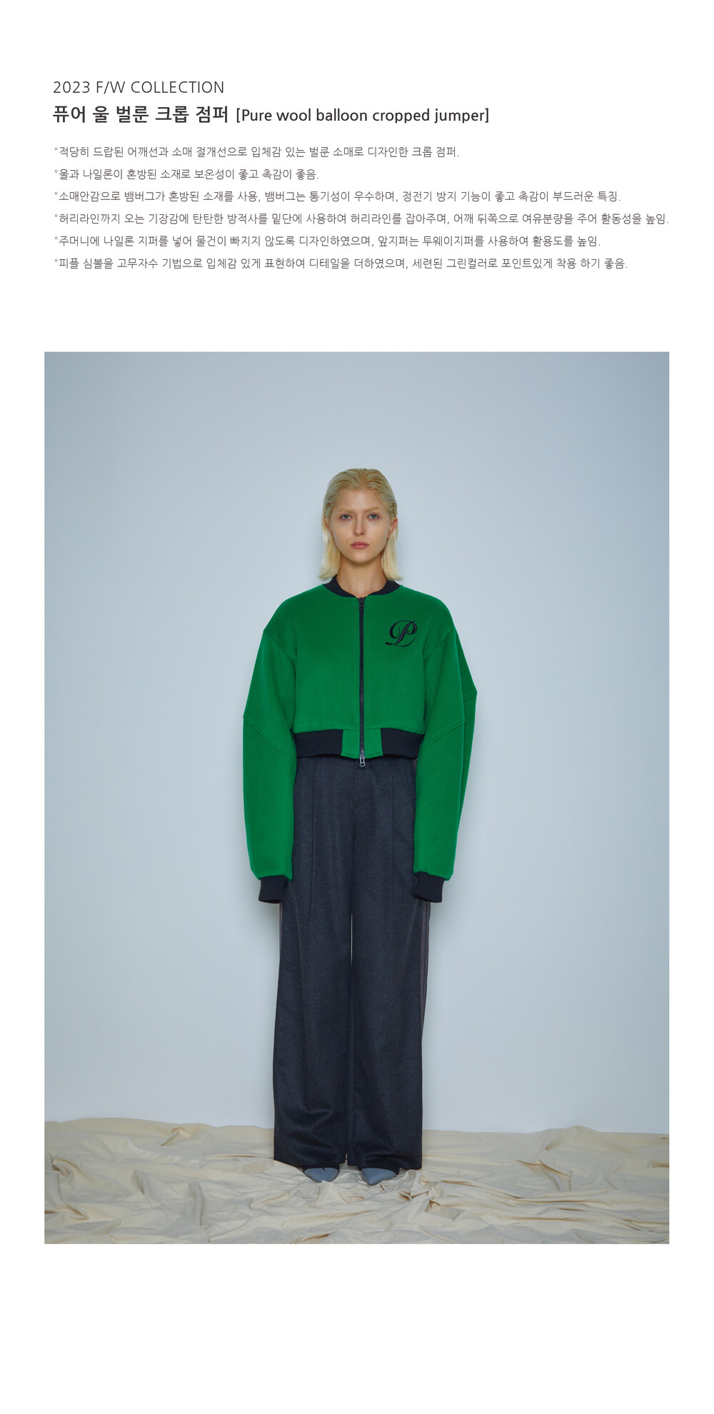°적당히 드랍된 어깨선과 소매 절개선으로 입체감 있는 벌룬 소매로 디자인한 크롭 점퍼.
